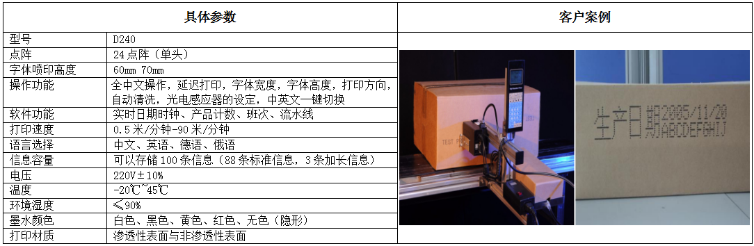 D240大字符噴碼機(jī)特點(diǎn)* 外觀經(jīng)典,時(shí)尚實(shí)用 * 寶石噴片,堅(jiān)固耐用 * 字高11~20000mm可選 * 可選配單機(jī)或多臺(tái)組合
